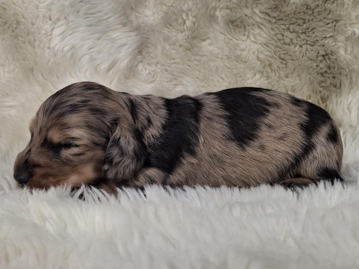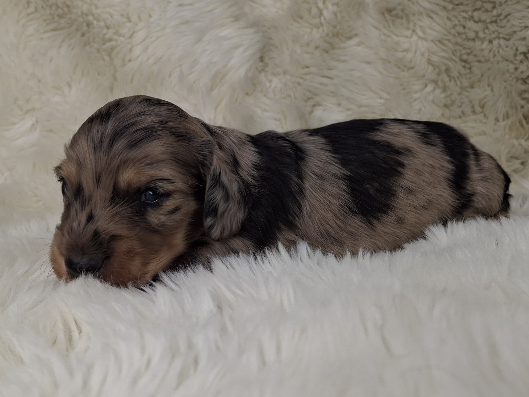 This beautiful Male Black & Cream Dapple Longhaired puppy will be ready to go to it's new home anytime starting on Monday, May 25, 2026.